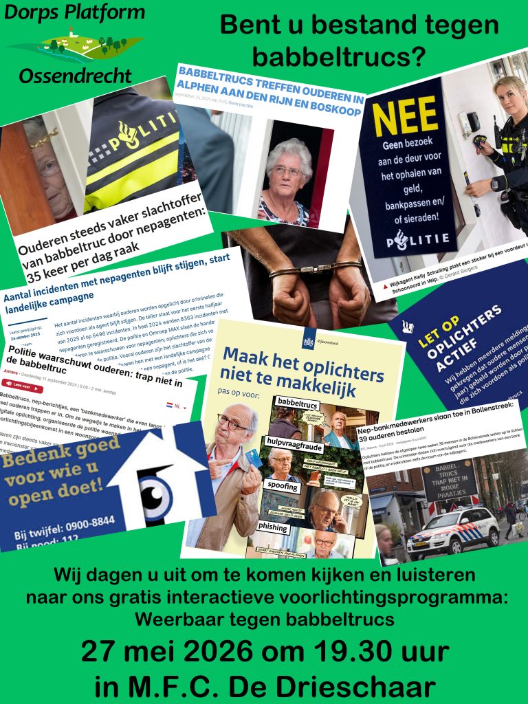 Ossendrecht – Dorpsplatform Ossendrecht organiseert een informatieve en interactieve thema-avond rond het actuele onderwerp babbeltrucs en vormen van oplichting. De avond is bedoeld om inwoners weerbaarder te maken tegen deze steeds vaker voorkomende praktijken.